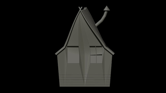 This was the house I made on friday that I was concepting in 3D. I then brought it into Zbrush to sculpt on and messed with its shape to give it a more Tim Burton feel to it. I then passed these images off to Leah and she did some draw overs of them and they turned out really good.